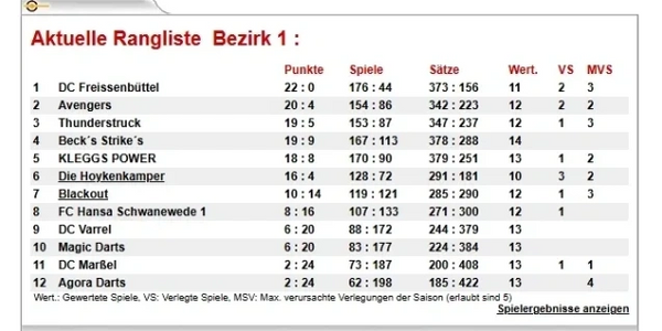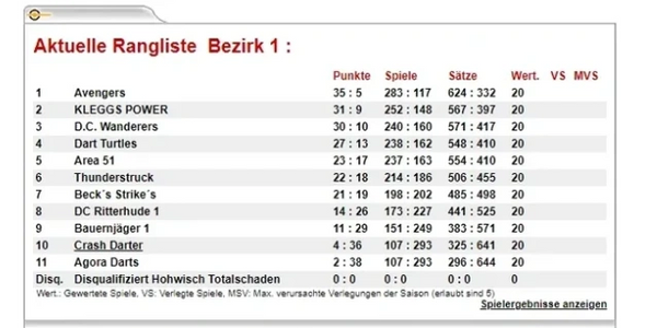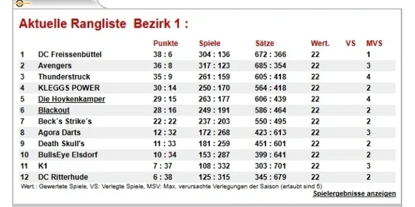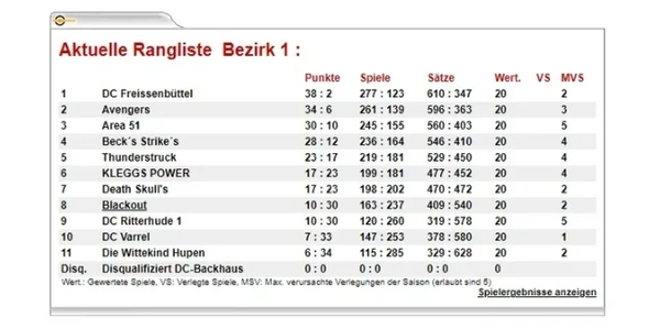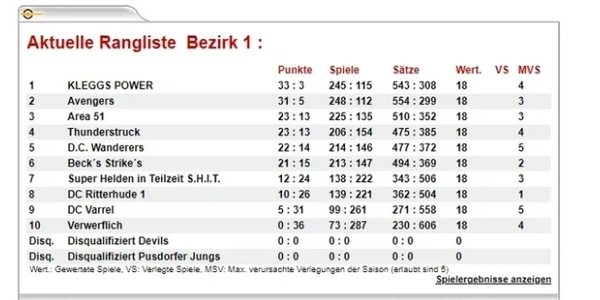 Aktuell hängen wir noch mit einem Nachholspiel zurück. Beck`s Strike`s erwischte gegen uns einen rabenschwarzen Tag und musste sich 3:17 geschlagen geben...Kopf hoch Jungs das wird wieder. Auf jeden Fall ist es sehr eng in der Liga und es bleibt spannend.
